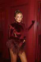 Merlot Red Velvet Long Sleeve Ostrich Feather Playsuit