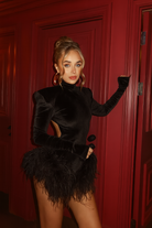 Noir Black Velvet Long Sleeve Ostrich Feather Playsuit
