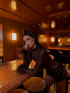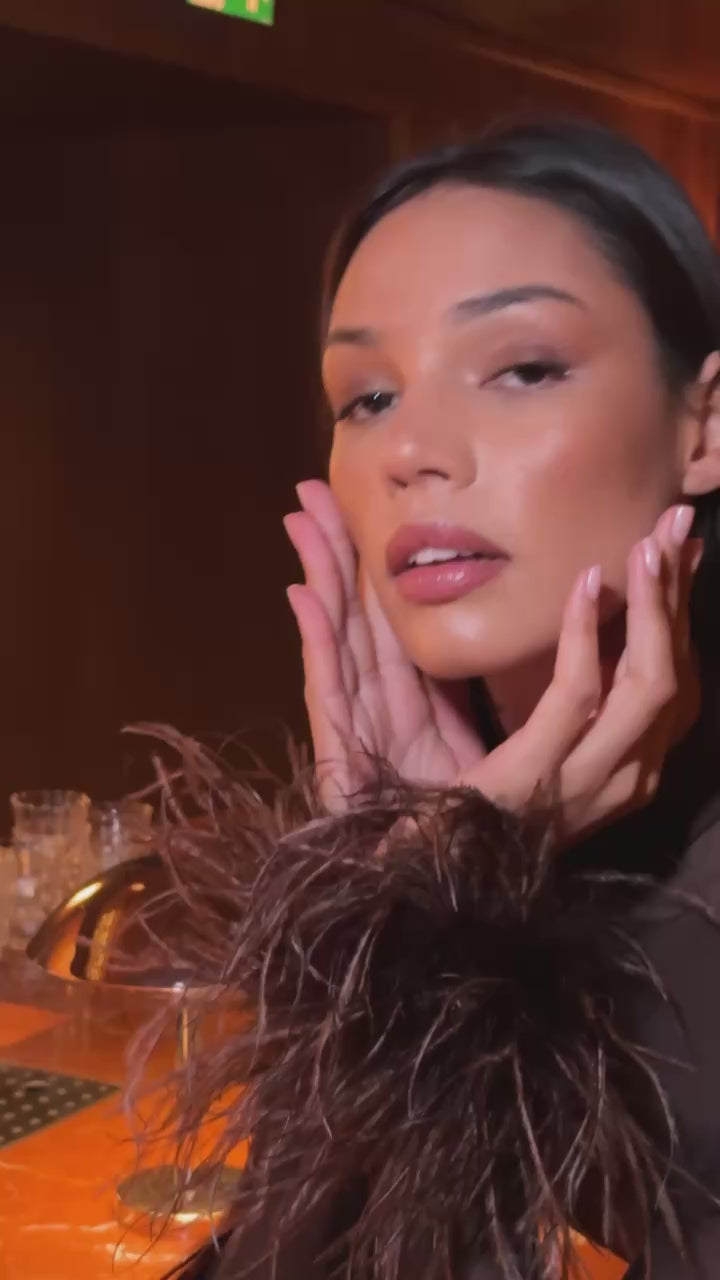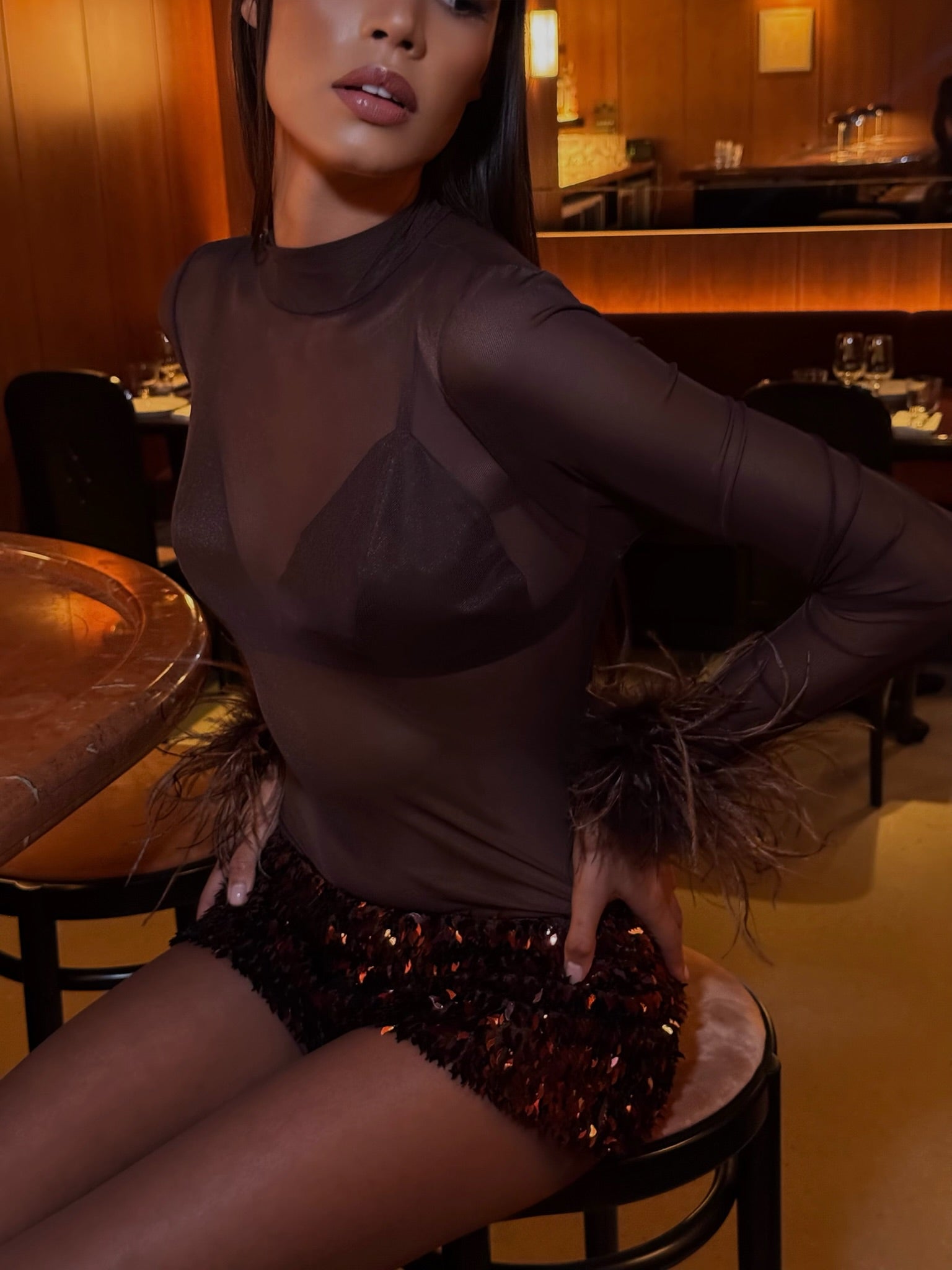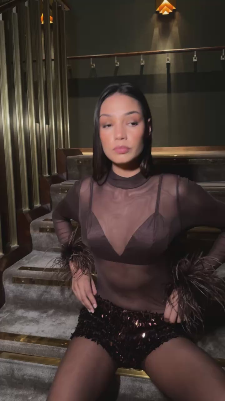 Espresso Brown Long sleeve sheer Bodysuit & Bralet with Ostritch Feather Cuffs